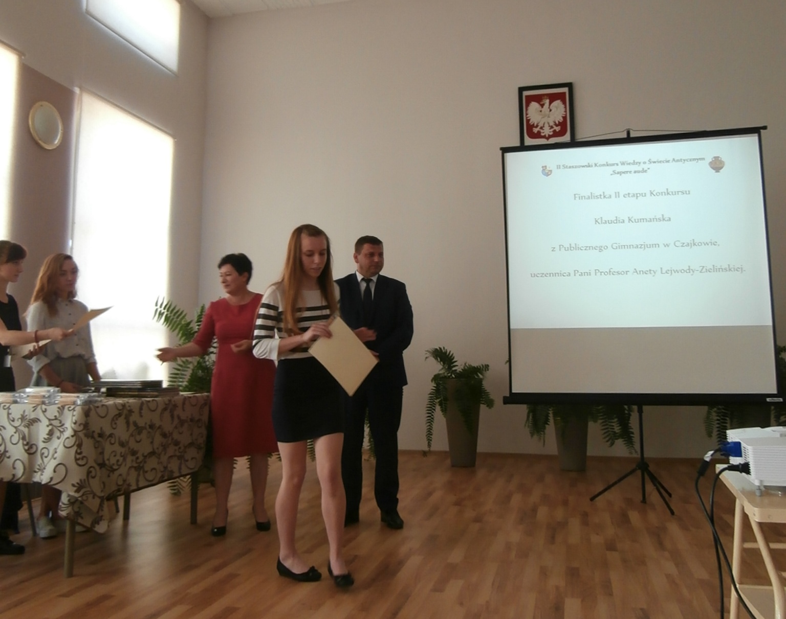 Ernest Kodyra uczeń klasy IIIA zajął I miejsce w II Staszowskim Konkursie Wiedzy o Świecie Antycznym „Sapere Aude”, natomiast Klaudia Kumańska uczennica klasy IIIB została finalistką konkursu. Opiekunami uczniów były nauczycielki języka polskiego p. Joanna Balicka–Wilusz i p. Aneta Lejwoda–Zielińska oraz nauczycielka historii p. Krystyna Gawłowicz.
