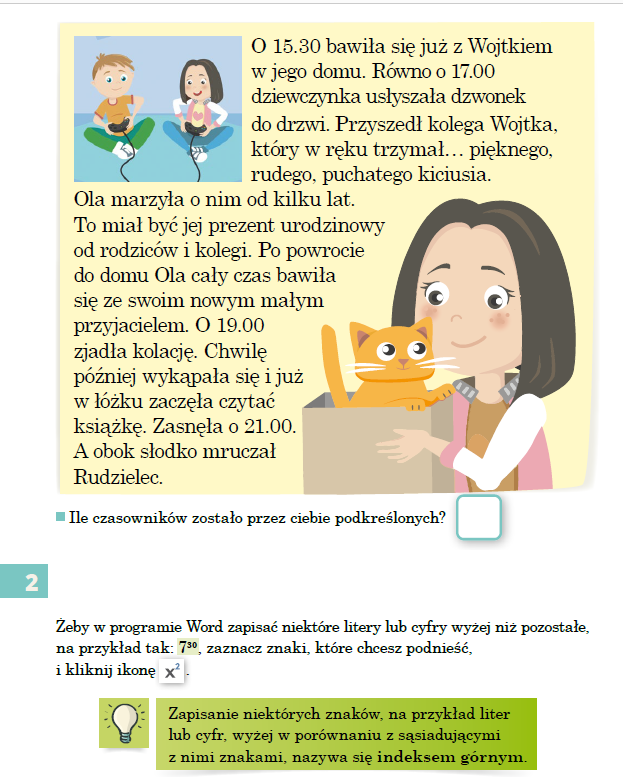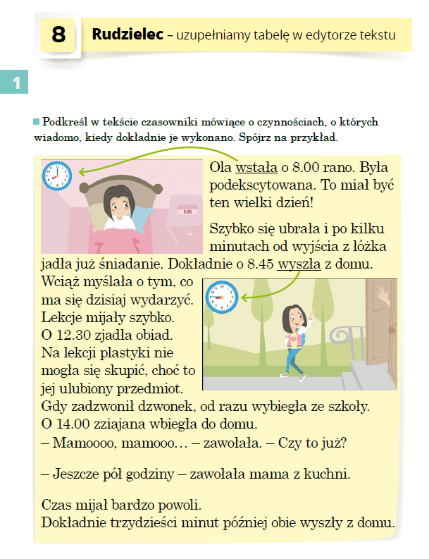 W dostępnym edytorze tekstu wykonajcie tabelę zawierającą 2 kolumny, w których umieścicie godziny i wykonywane czynności. Ma to być plan dnia. Do zapisu godzin możecie zastosować "indeks górny".