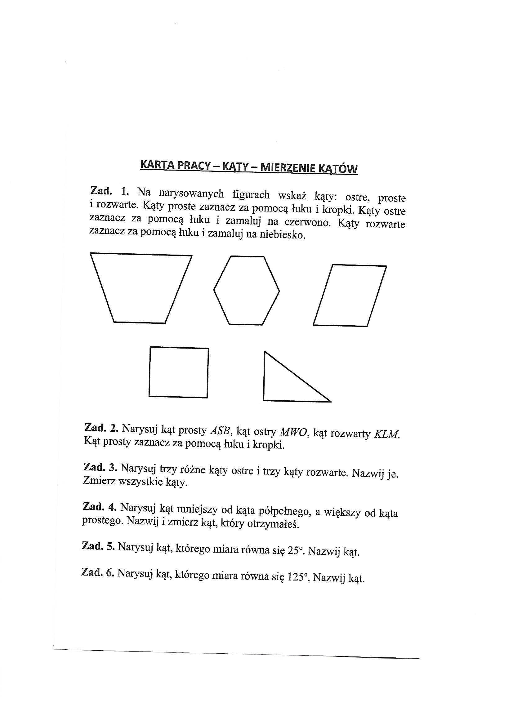 Proszę, abyście wydrukowali sobie zaproponowane przeze mnie karty pracy, uzupełnili je, częściowo także w zeszytach (wykonali rysunki kątów w zeszytach) i wkleili do zeszytu. Termin wykonania - do środy. W środę lub we czwartek spodziewajcie się nowych materiałów.